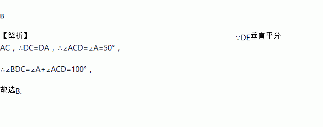 B 【解析】∵DE垂直平分AC,∴DC=DA,∴∠ACD=∠A=50°, ∴∠BDC=∠A+∠ACD=100°, 故选B.