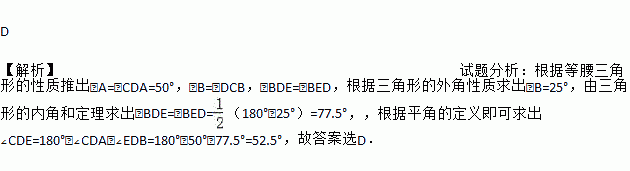 如图,△ABC中,D为AB上一点,E为BC上一点,且AC=CD=BD=BE,∠A=50°,则∠CDE的度数为( )