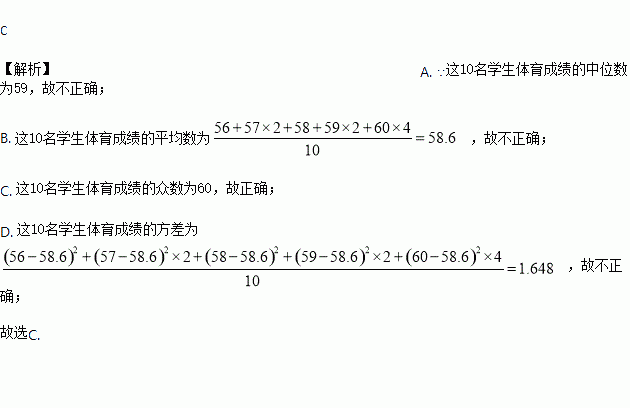 C. 这10名学生体育成绩的众数为60 D. 这10名学生体育成绩的方差为60
