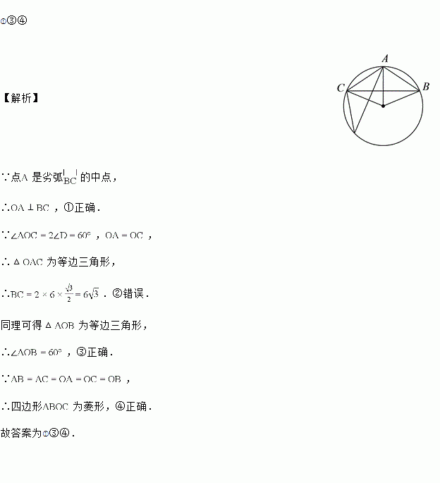 如图,在半径为的⊙中,点是劣弧的中点,点是优弧上一点,且,下列四个结论:①;②;③;④四边形是菱形,其中正确结论的序号是__________.