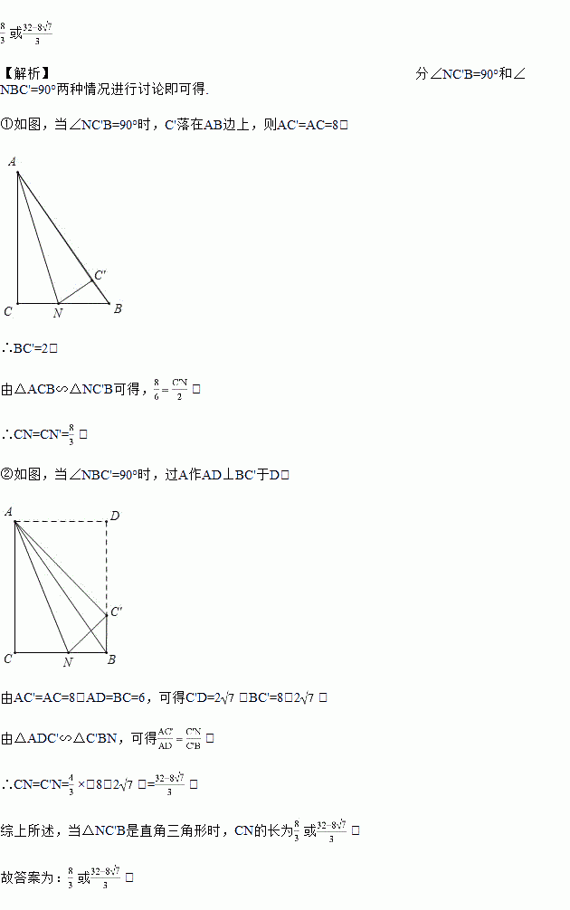 如图,在Rt△ACB中,∠ACB=90°,AB=10,BC=6,点N是线段BC上的一个动点,将△ACN沿AN折叠,使点C落在点C'处,当△NC'B是直角三角形时,CN的长为_____.