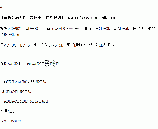 如图,∠C=90°,点D在BC上,BD=6,AD=BC,cos∠ADC=,求CD的长.