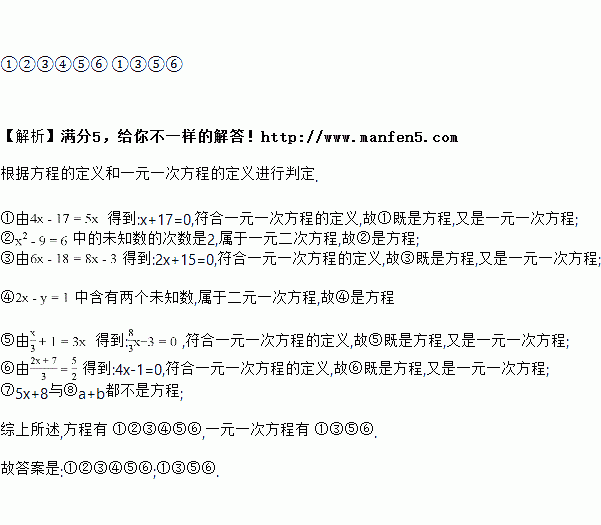 下列各式:①;②;③;④;⑤;⑥;⑦;⑧中方程有________,一元一次方程有________(只填序号).
