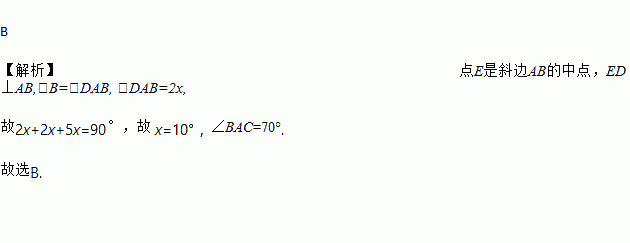 如图,在△ABC中,∠C=90°,点E是斜边AB的中点,ED⊥AB,且∠CAD: ∠BAD=5:2,则∠BAC=( )