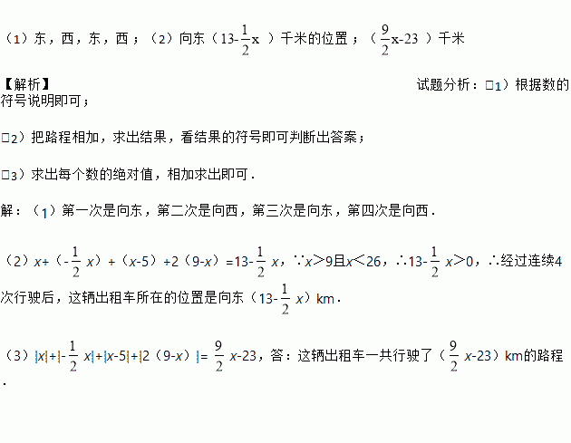 (9分)一辆出租车从A地出发,在一条东西走向的街道上往返,每次行驶的路程(记向东为正)记录如下(x>9且x<26,单位:km)