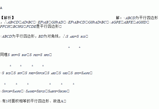 如图,在平行四边形ABCD中,过对角线BD上一点P作EF∥AB,GH∥AD,与各边交点分别为点E,F,G,H,则图中面积相等的平行四边形的对数为( )