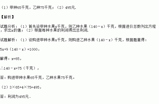 某水果销售点用1000元购进甲、乙两种新出产的水果共140千克,这两种水果的进价、售价如表所示: