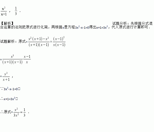 先化简,再求值:(﹣)÷,其中x是方程3x2﹣x﹣1=0的根.