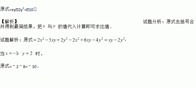 原式=xy﹣2y2=﹣10. 【解析】试题分析:原式去括号合并得到最简结果,把与的值代入计算即可求出值. 试题解析:原式 当 时, 原式=﹣2﹣8=﹣10.