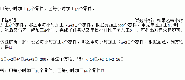 甲每小时加工16个零件,乙每小时加工14个零件. 【解析】试题分析:如果乙每小时加工x个零件,那么甲每小时加工(x+2)个零件,根据要加工200个零件,甲先单独加工5小时,然后又与乙一起加工4小时,完成了任务以及甲每小时比乙多加工2个,可列出方程求解即可. 试题解析:【解析】 设乙每小时加工x个零件,那么甲每小时加工(x+2)个零件.根据题意,列方程,得: 5(x+2)+4(x...