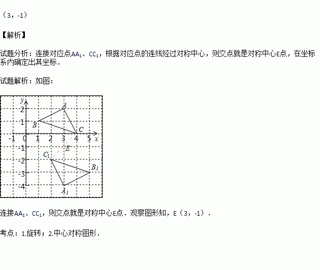 如图,在平面直角坐标系中, 若△ABC与△A1B1C1关于E点成中心对称, 则对称中心E点的坐标是 .