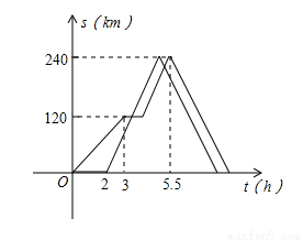 甲、乙两辆汽车沿同一路线从A地前往B地,甲以千米/时的速度匀速行驶,途中出现故障后停车维修,修好后以千米/时的速度继续行驶;乙在甲出发2小时后匀速前往B地,比甲早30分钟到达.到达B地后,乙按原速度返回A地,甲以千米/时的速度返回A地.设甲、乙两车与A地相距s(千米),甲车离开A地的时间为t(时),s与t之间的函数图象如图所示.