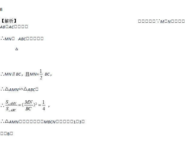 如图,在△ABC中,M,N分别是边AB,AC的中点,则△AMN的面积与四边形MBCN的面积比为