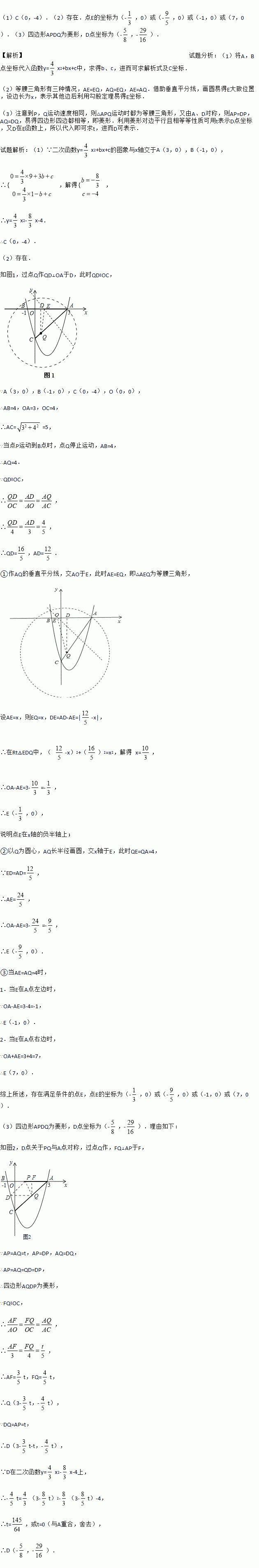 (1)C(0,-4).(2)存在.点E的坐标为(-,0)或(-,0)或(-1,0)或(7,0).(3)四边形APDQ为菱形,D点坐标为(-,-). 【解析】试题分析:(1)将A,B点坐标代入函数y=x2+bx+c中,求得b、c,进而可求解析式及C坐标. (2)等腰三角形有三种情况,AE=EQ,AQ=EQ,AE=AQ.借助垂直平分线,画圆易得E大致位置,设边长为x,表示其他边后利用勾股定...