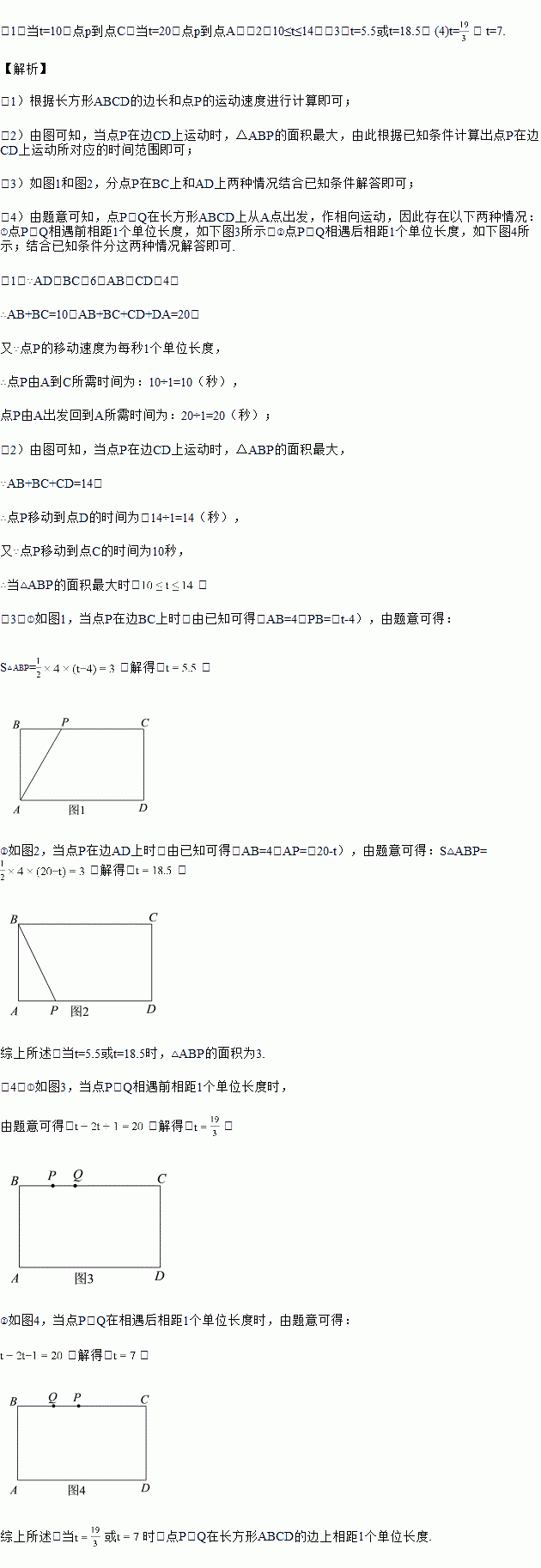 如图,长方形ABCD中,AD=BC=6,AB=CD=4.点P从点A出发,以每秒1个单位的速度沿A→B→C→D→A的方向运动,回到点A停止运动.设运动时间为t秒.