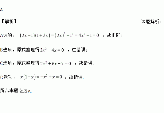 A. (2x-1)(1+2x)=0 B. 3x2=4x