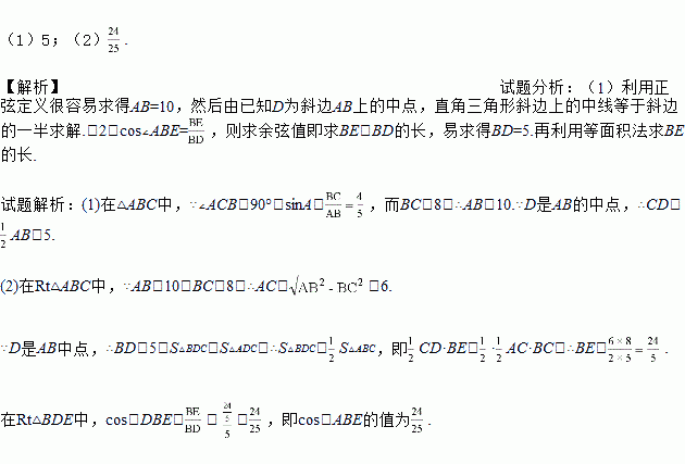 如图,△ABC中,∠ACB=90°,sinA=,BC=8,点D是AB的中点,过点B作CD的垂线,垂足为点E.