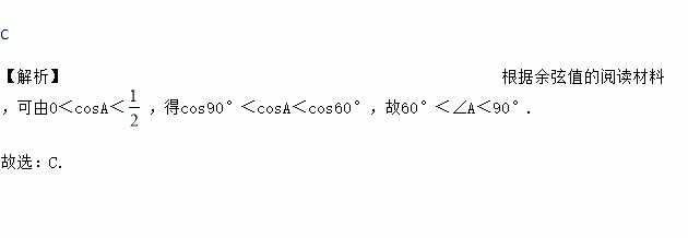 C 【解析】根据余弦值的阅读材料,可由0<cosA<,得cos90°<cosA<cos60°,故60°<∠A<90°. 故选:C.