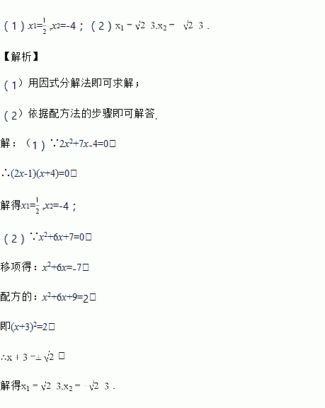 解方程:(1)2x2+7x-4=0 (2) x2+6x+7=0(配方法)