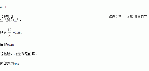 48. 【解析】试题分析:设被调查的学生人数为x人, 则有=0.25, 解得x=48, 经检验x=48是方程的解. 故答案为48;