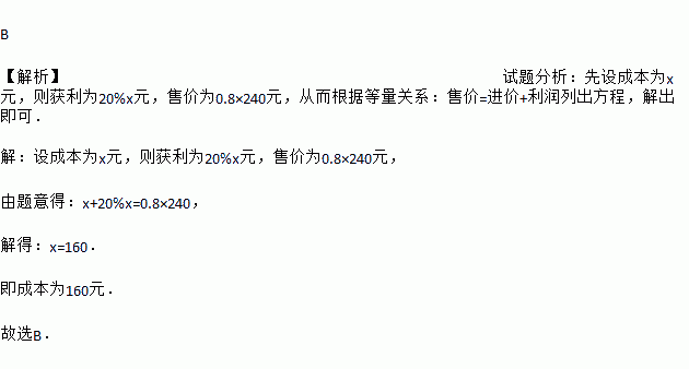 B 【解析】试题分析:先设成本为x元,则获利为20%x元,售价为0.8×240元,从而根据等量关系:售价=进价+利润列出方程,解出即可. 【解析】 设成本为x元,则获利为20%x元,售价为0.8×240元, 由题意得:x+20%x=0.8×240, 解得:x=160. 即成本为160元. 故选B.