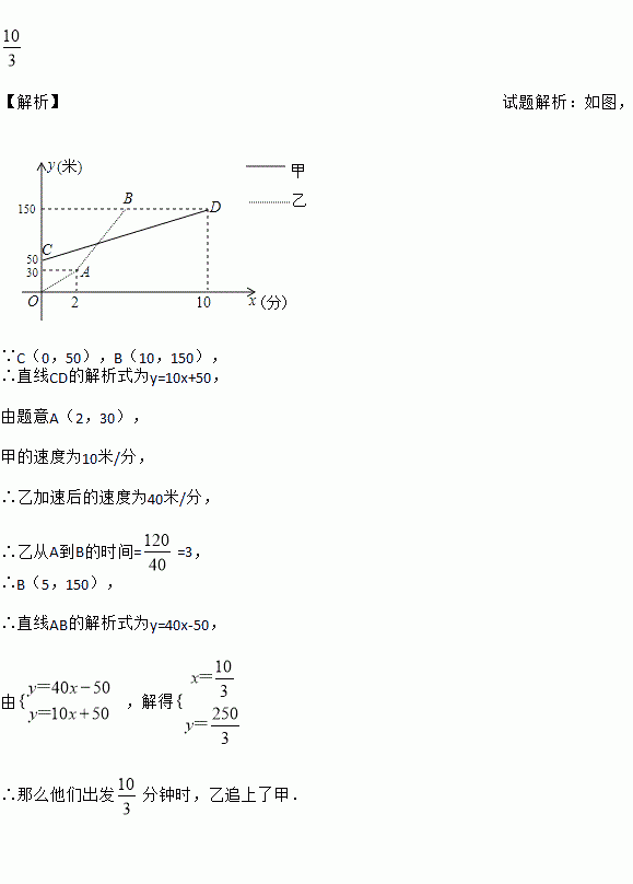 甲、乙两人分别从两地同时出发登山,甲、乙两人距山脚的竖直高度y(米)与登山时间x(分)之间的图象如图所示,若甲的速度一直保持不变,乙出发2分钟后加速登山,且速度是甲速度的4倍,那么他们出发_____分钟时,乙追上了甲.