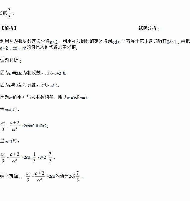 若a与2互为相反数,c与d互为倒数,m的平方与它本身相等,请你求