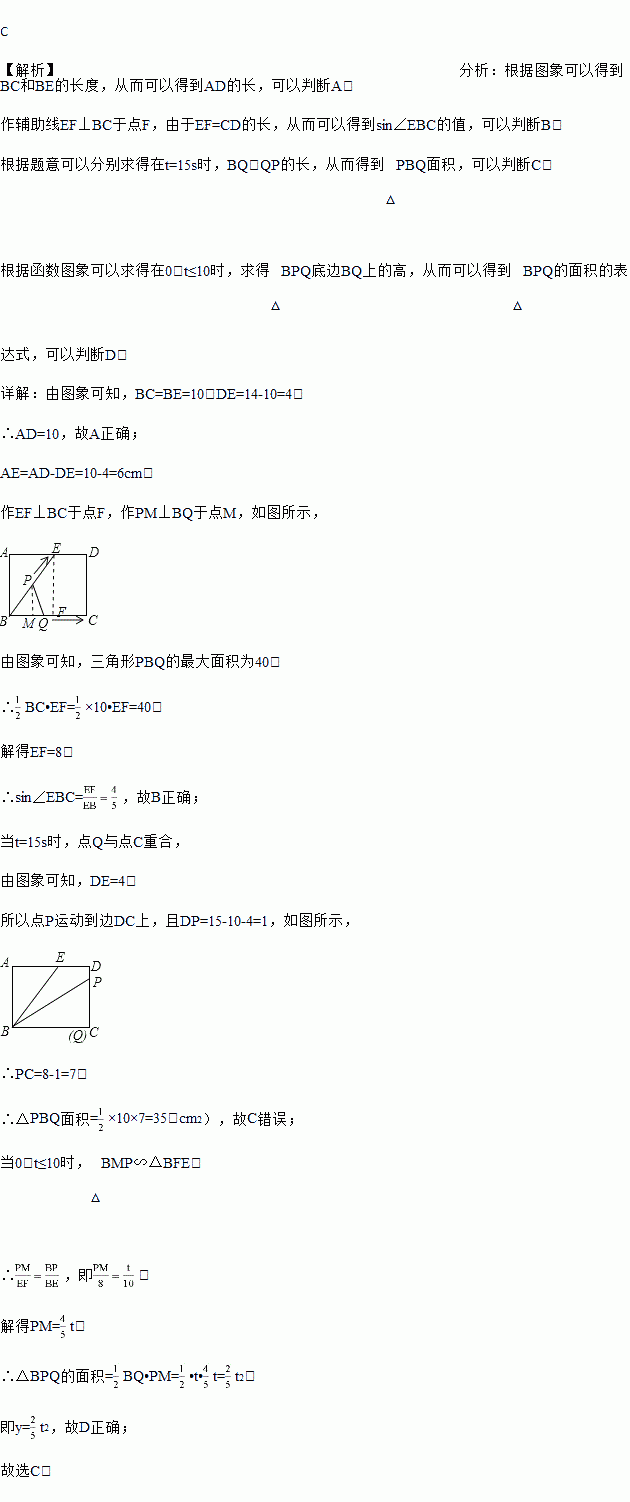 如图1,E为矩形ABCD边AD上一点,点P从点B沿折线BE﹣ED﹣DC运动到点C时停止,点Q从点B沿BC运动到点C时停止,它们运动的速度都是1cm/s.若P,Q同时开始运动.设运动时间为t(s),△BPQ的面积为y(cm2).已知y与t的函数图象如图2,则下列结论错误的是( )