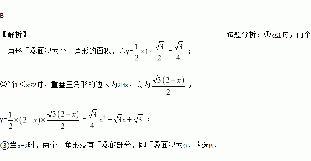 如图,边长分别为1和2的两个等边三角形,开始它们在左边重合,大三角形固定不动,然后把小三角形自左向右平移直至移出大三角形外停止.设小三角形移动的距离为x,两个三角形重叠面积为y,则y关于x的函数图象是( )