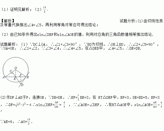 如图,AB是⊙O的一条弦,E是AB的中点,过点E作EC⊥OA于点C,过点B作⊙O的切线交CE的延长线于点D.