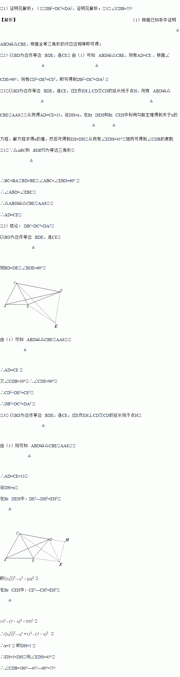 (3)如图3,点D是等边三角形△ABC外一点,若DA=13, DB=