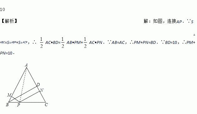 如图,在△ABC中,AB=AC,点P是BC边上的任意一点,PM⊥AB,PN⊥AC,垂足分别为M、N,BD是AC边上的高,BD=10,则PM+PN=_________.