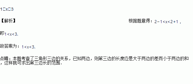 一个三角形的三条边长分别为1、2、x,则x的取值范围是_______.