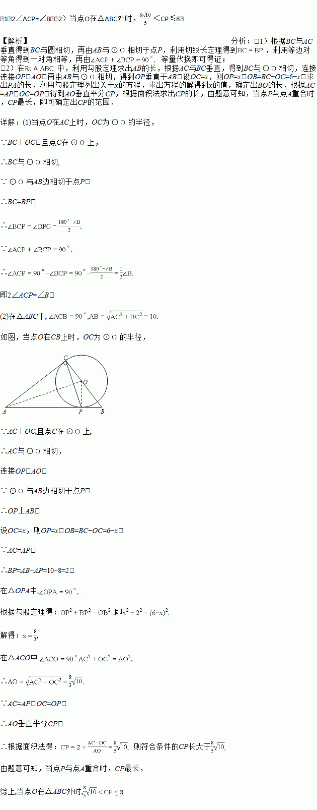 (2)如图②,AC=8,BC=6,当点O在△ABC外部时,求CP长的取值范围.