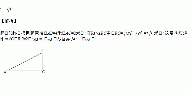 一条斜坡长4米,高度为2米,那么这条斜坡坡比i=________ .