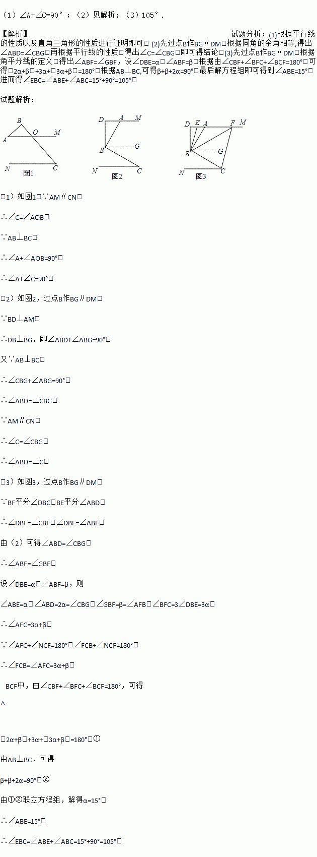 (3)如图3,在(2)问的条件下,点E、F在DM上,连接BE、BF、CF,BF平分∠DBC,BE平分∠ABD,若∠FCB+∠NCF=180°,∠BFC=3∠DBE,求∠EBC的度数.