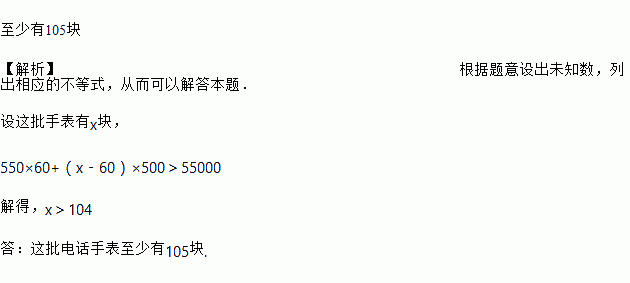某经销商销售一批电话手表,第一个月以550元/块的价格售出60块,第二个月起降价,以500元/块的价格将这批电话手表全部售出,销售总额超过了5.5万元.这批电话手表至少有多少块?
