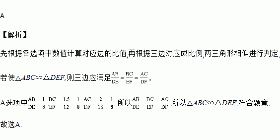 A. AB=1,BC=1.5,AC=2,DE=8,EF=12,DF=16