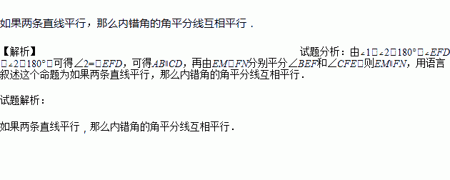 如图,直线AB,CD被EF所截,∠1+∠2=180°,EM,FN分别平分∠BEF和∠CFE,则EM∥FN.