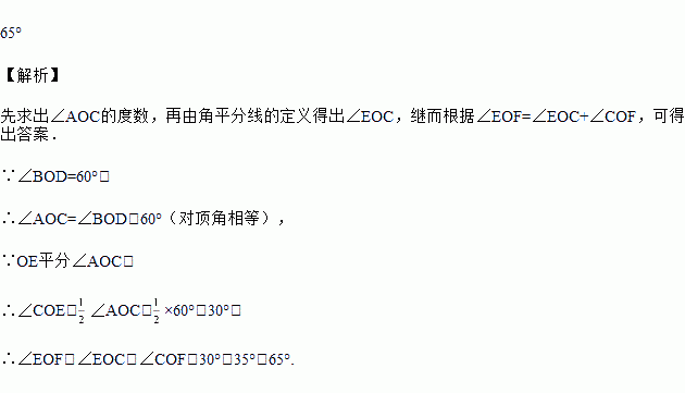 如图,直线AB,CD相交于点O,OE平分∠AOC,∠COF=35°,∠BOD=60°,求∠EOF的度数.