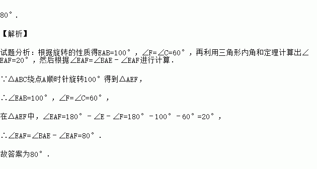 如图,△ABC绕点A顺时针旋转100°得到△AEF,若∠C=60°,∠E=100°,则α的度数为 .