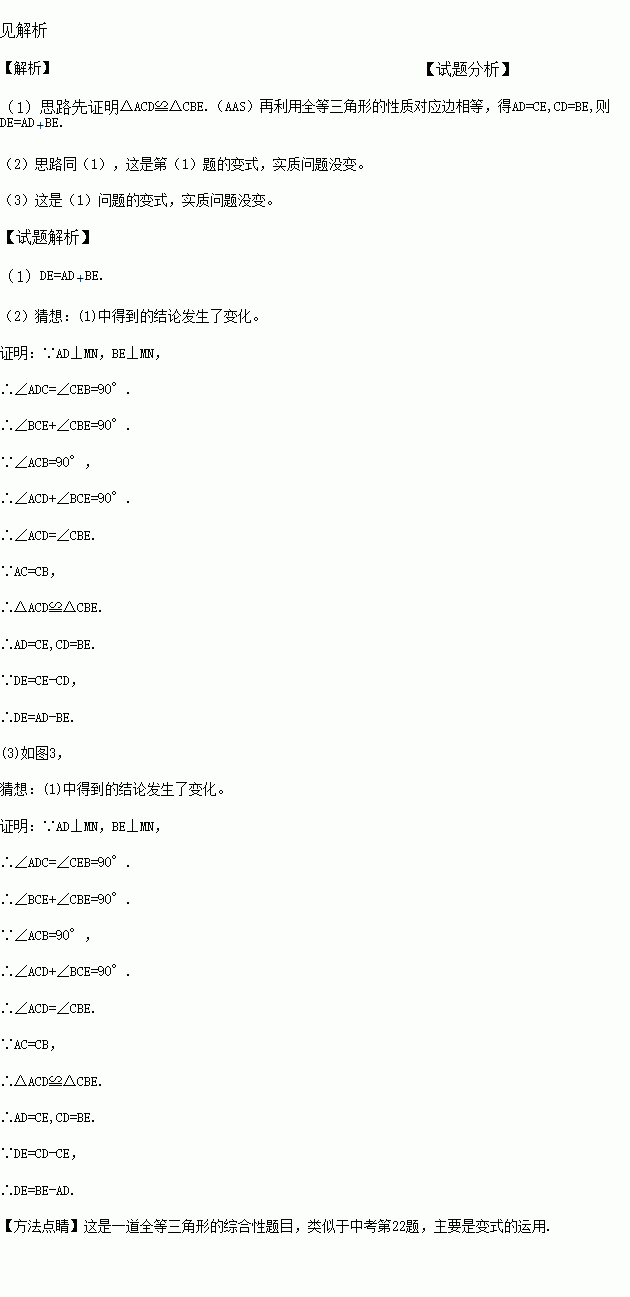 (1)当MN绕点C旋转到图1的位置时,请你探究线段DE、AD、BE之间的数量关系(直接写出结论,不要求写出证明过程);