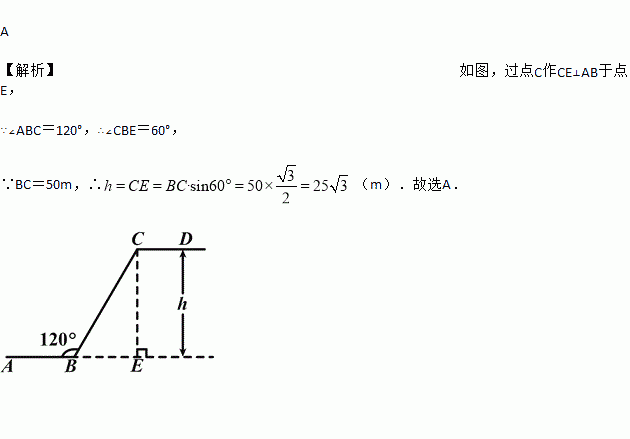 如图是某水库大坝横断面示意图.其中AB、CD分别表示水库上下底面的水平线,∠ABC=120°,BC的长是50m,则水库大坝的高度h是( )