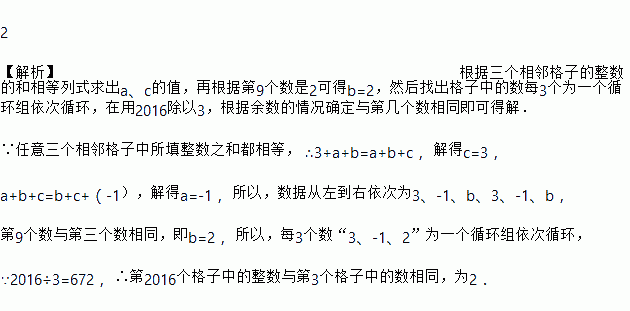从左到右每个小格中都填入一个整数,使得其中任意三个相邻格子中所填整数之和都相等,则第2016个格子中的数为_____.