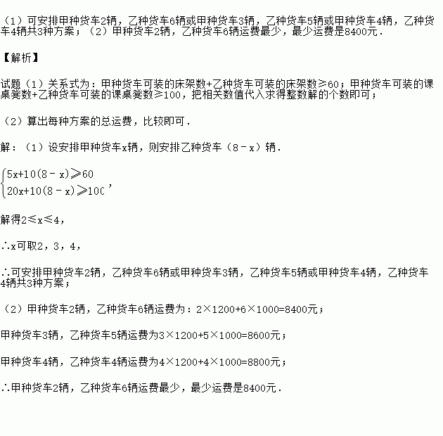 情系灾区.5月12日我国四川汶川县发生里氏8.0级大地震,地震给四川,甘肃,陕西等地造成巨大人员伤亡和财产损失.灾难发生后,我校师生和全国人民一道,迅速伸出支援的双手,为灾区人民捐款捐物.为了支援灾区学校灾后重建,我校决定象灾区捐助床架60个,课桌凳100套.现计划租甲、乙两种货车共8辆将这些物质运往灾区,已知一辆甲货车可装床架5个和课桌凳20套,一辆乙货车可装床架10个和课桌凳10套.