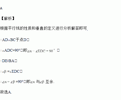 如图所示,AD⊥BC于点D,DE∥BA交边AC于点E,则∠α与∠β的关系是( )