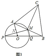 (3)如图3,当线段AB与⊙O有两个公共点A、M时,连接MQ,如果AO⊥PM于点D,求CM的长度.
