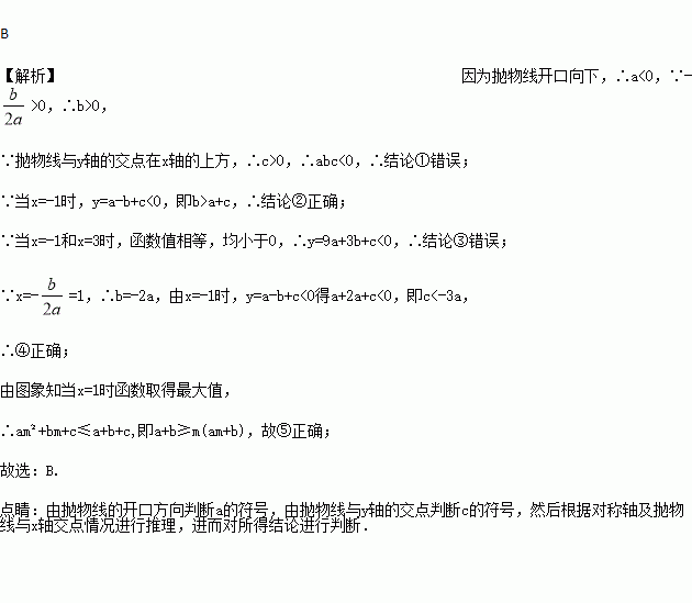 已知二次函数y=ax2+bx+c(a≠0)的图象如图所示,有下列5个结论:①abc>0; ②b>a+c;③9a+3b+c>0; ④c<-3a; ⑤a+b+c≥m(am+b)+c,其中正确的有( )个。