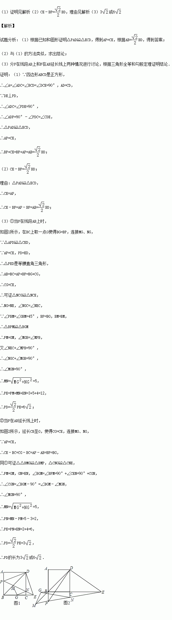 (3)若直线PE分别交直线BD、CD于点M、N,PM=3,EN=4,求PD的长.