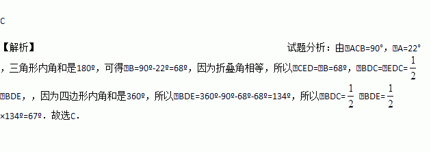 如图,△ABC中,∠ACB=90°,沿CD折叠△CBD,使点B恰好落在AC边上的点E处.若∠A=22°,则∠BDC等于( )